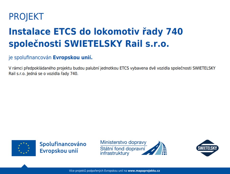 Společnost SWIETELSKY Rail s.r.o. realizuje v roce 2026 projekt Instalace ETCS do lokomotiv řady 740, který je spolufinancován z fondů Evropské unie v rámci Programu Doprava 2021–2027 z rozpočtu Státního fondu dopravní infrastruktury. Cílem projektu je vybavení vybraných lokomotiv moderním zabezpečovacím systémem ETCS, jenž se stává standardem na stále větší části evropské železniční sítě.